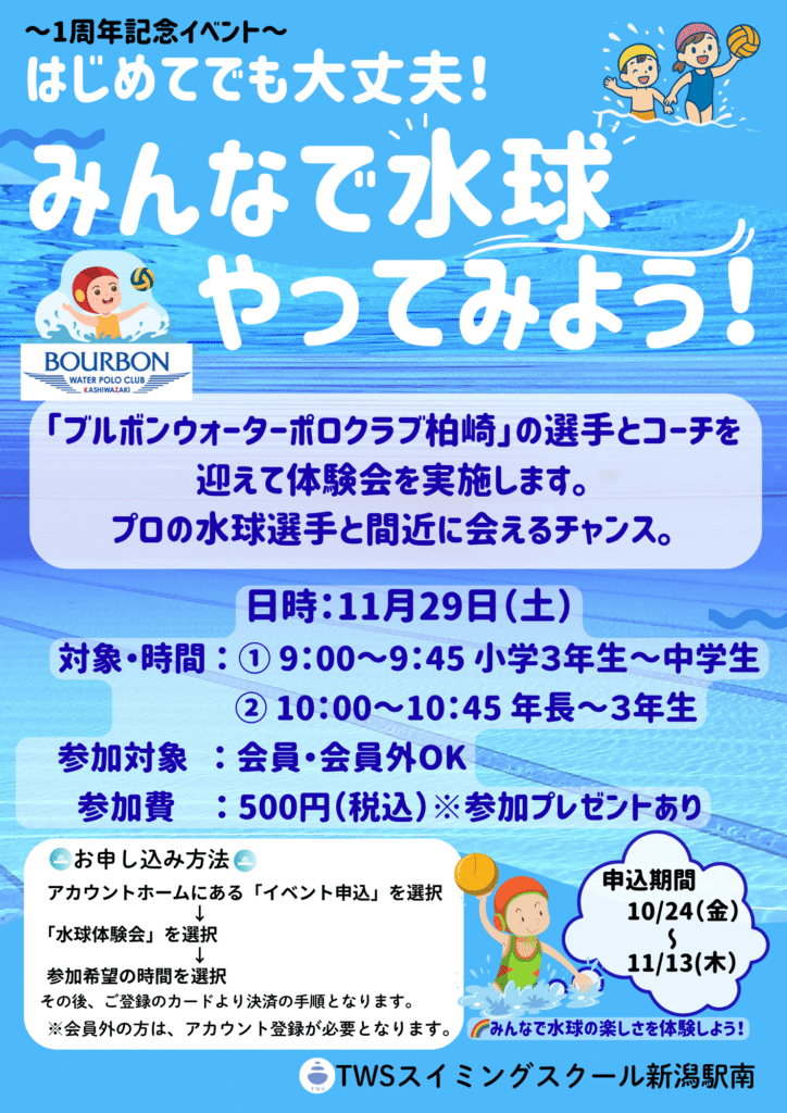 お待たせしました。11月29日土曜日に、開催の「水球体験会・みんなで水球やってみよう」の